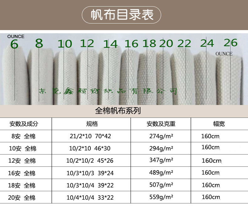 鑫超纺织帆布厂供应不同克重帆布参数可以参考下图表